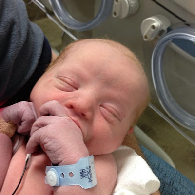 He took a couple of breaths on his own and Dr. Watke thought he looked okay, so she put him on my stomach (she was amazing - remembered every request I had written in my birth plan!). But as soon as she did so, he stopped responding and they had to take him over to the warmer and give him oxygen. Once he pinked up again, they showed him to me quickly all wrapped up, then whisked him off to the NICU for observation.